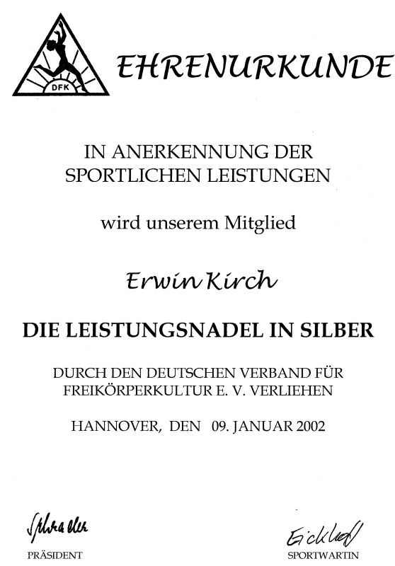 Für meine sportliche Verdienste vom DFK mit der Ehrenurkunde in Silber und Gold ausgezeichnet.