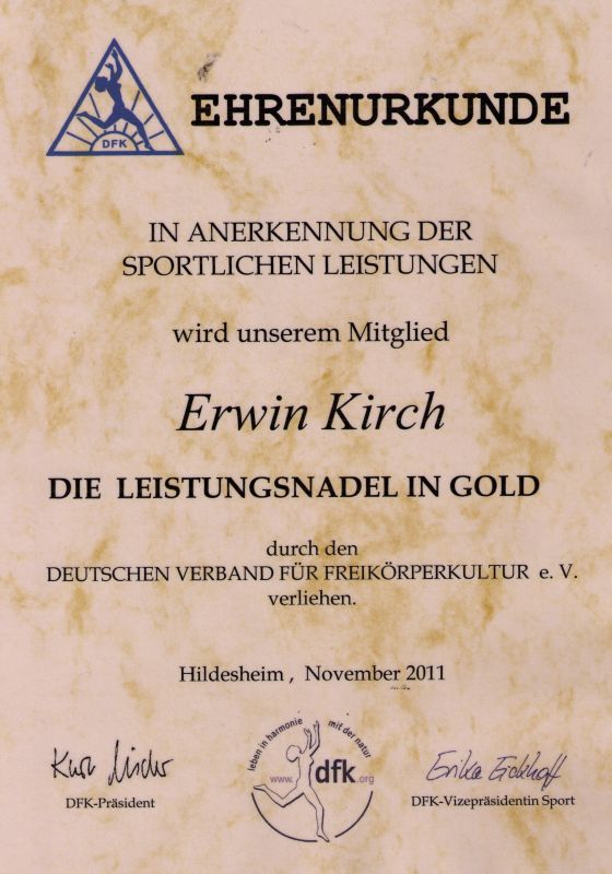 Für meine sportliche Verdienste vom DFK mit der Ehrenurkunde in Silber und Gold ausgezeichnet.